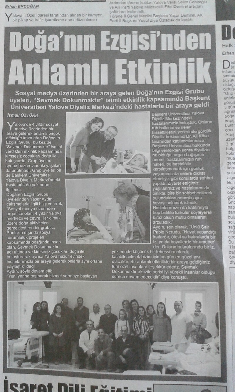 Doğanın Ezgisinden Anlamlı Etkinlik Doğanın Ezgisi grubunun düzenlediği etkinliğe katılan Mali Müşavir Selda Günay diyaliz hastalarıyla bir araya geldi. İLETİŞİM FORMUNDAN BİZE YAZARAK ULAŞABİLİRSİNİZ